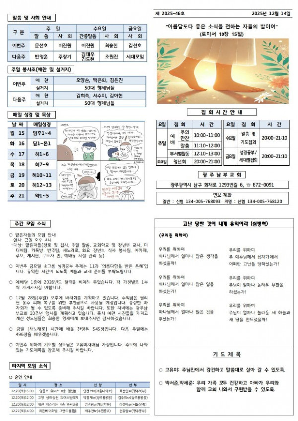 교회주보 2025년 12월 둘째주 주보 페이지 정보 작성일 12월 21일 2025년 본문 2025년 12월 둘째주 주보입니다. 목록 이전글 교회소식 2025년 12월 셋째주 주보 12월 21일 2025년 다음글 교회주보 2025년 12월 첫째주 주보 12월 21일 2025년