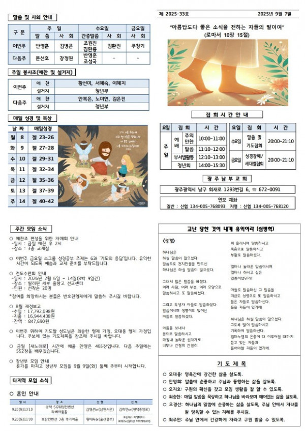 교회주보 2025년 9월 첫째주 주보 페이지 정보 작성일 10월 20일 2025년 본문 2025년 9월 첫째주 주보입니다. 목록 이전글 교회주보 2025년 9월 둘째주 주보 10월 20일 2025년 다음글 교회주보 2025년 8월 다섯째주 주보 10월 20일 2025년