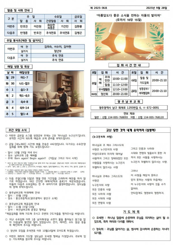 교회주보 2025년 9월 넷째주 주보 페이지 정보 작성일 10월 20일 2025년 본문 2025년 9월 넷째주 주보입니다. 목록 이전글 교회주보 2025년 10월 첫째주 주보 10월 20일 2025년 다음글 교회주보 2025년 9월 셋째주 주보 10월 20일 2025년