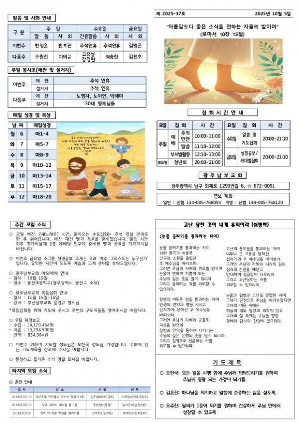 교회주보 2025년 10월 첫째주 주보 페이지 정보 작성일 10월 20일 2025년 본문 2025년 10월 첫째주 주보입니다. 목록 이전글 교회주보 2025년 10월 둘째주 주보 10월 20일 2025년 다음글 교회주보 2025년 9월 넷째주 주보 10월 20일 2025년