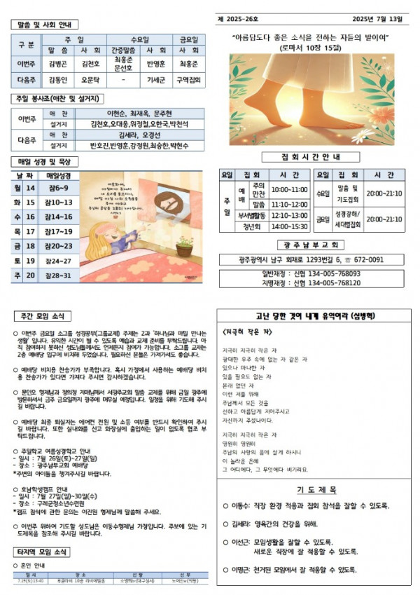 교회주보 2025년 7월 둘째주 주보 페이지 정보 작성일 07월 31일 2025년 본문 2025년 7월 둘째주 주보입니다. 목록 이전글 교회주보 2025년 7월 셋째주 주보 07월 06일 2025년 다음글 교회주보 2025년 7월 첫째주 주보 07월 06일 2025년