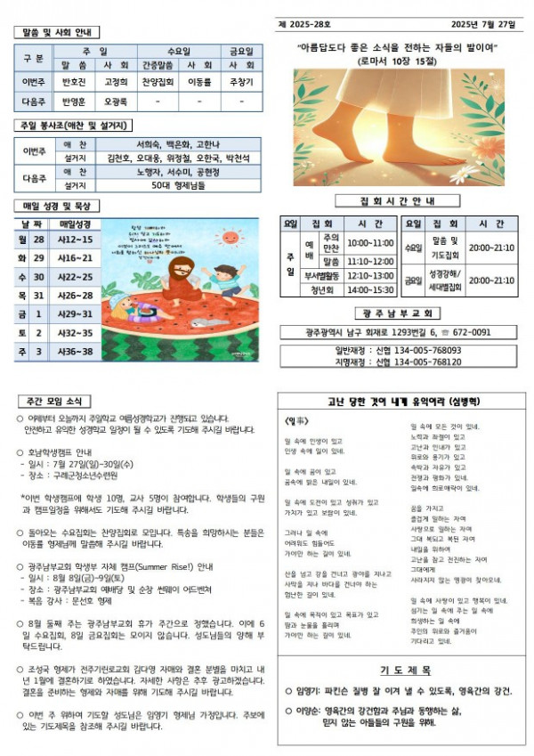교회주보 2025년 7월 넷째주 주보 페이지 정보 작성일 07월 31일 2025년 본문 2025년 7월 넷째주 주보입니다. 목록 이전글 교회주보 2025년 8월 첫째주 주보 07월 31일 2025년 다음글 교회주보 2025년 7월 셋째주 주보 07월 31일 2025년