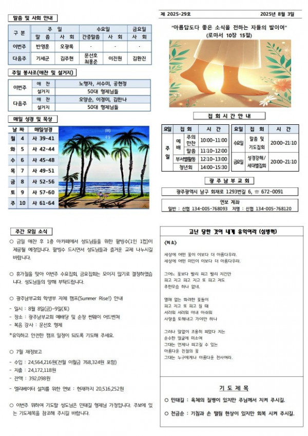 교회주보 2025년 8월 첫째주 주보 페이지 정보 작성일 08월 05일 2025년 본문 2025년 8월 첫째주 주보입니다. 목록 이전글 교회주보 2025년 8월 둘째주 주보 07월 31일 2025년 다음글 교회주보 2025년 7월 넷째주 주보 07월 31일 2025년