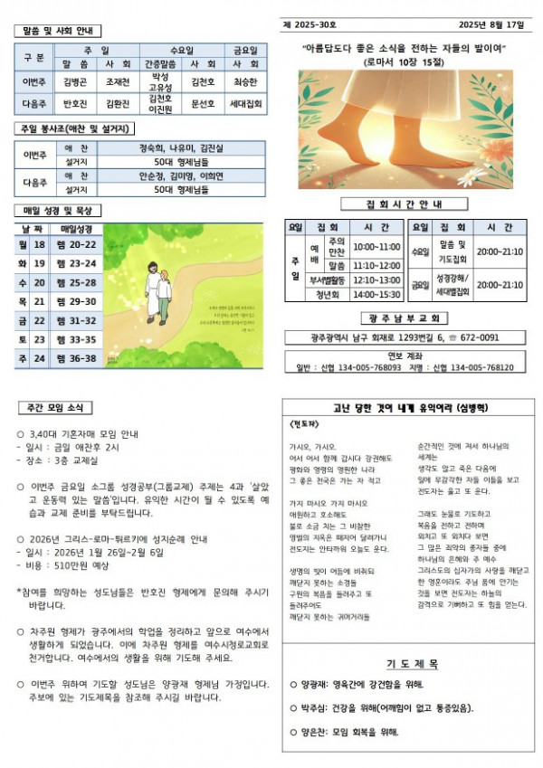 교회주보 2025년 8월 셋째주 주보 페이지 정보 작성일 08월 30일 2025년 본문 2025년 8월 셋째주 주보입니다. 목록 이전글 교회주보 2025년 8월 넷째주 주보 08월 11일 2025년 다음글 교회주보 2025년 8월 둘째주 주보 08월 11일 2025년