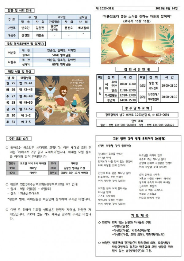 교회주보 2025년 8월 넷째주 주보 페이지 정보 작성일 08월 30일 2025년 본문 2025년 8월 넷째주 주보 목록 이전글 교회주보 2025년 8월 다섯째주 주보 08월 30일 2025년 다음글 교회주보 2025년 8월 셋째주 주보 08월 30일 2025년