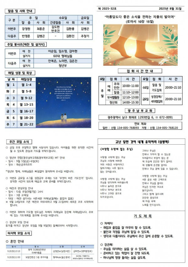 교회주보 2025년 8월 다섯째주 주보 페이지 정보 작성일 10월 20일 2025년 본문 2025년 8월 다섯째주 주보입니다. 목록 이전글 교회주보 2025년 9월 첫째주 주보 08월 30일 2025년 다음글 교회주보 2025년 8월 넷째주 주보 08월 30일 2025년