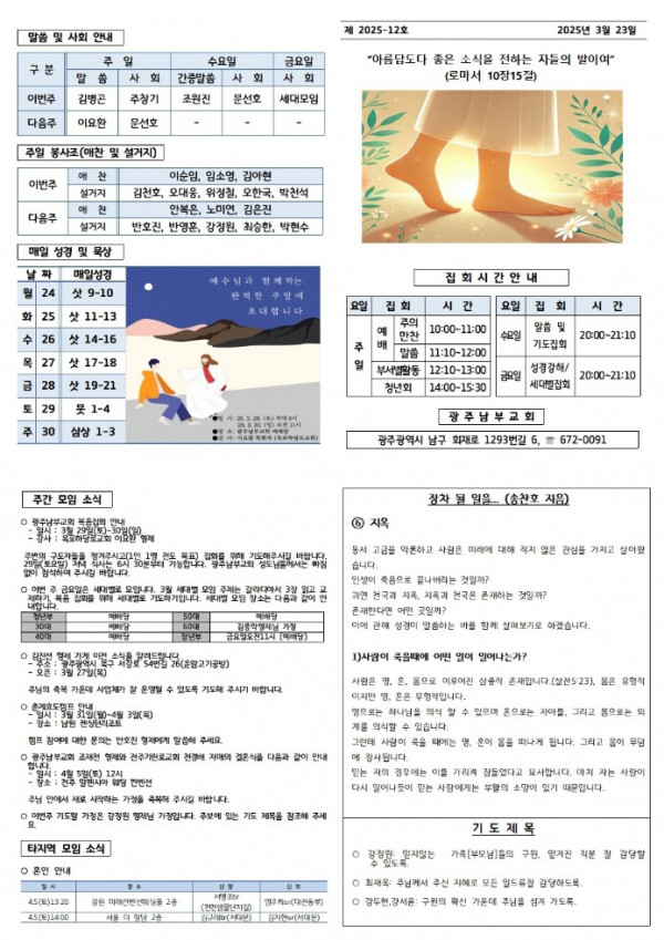 교회주보 2025년 3월 넷째주 주보 페이지 정보 작성일 04월 08일 2025년 본문 2025년 3월 넷째주 주보 목록 이전글 교회주보 2025년 3월 다섯째주 주보 04월 08일 2025년 다음글 교회주보 2025년 3월 셋째주 주보 04월 08일 2025년