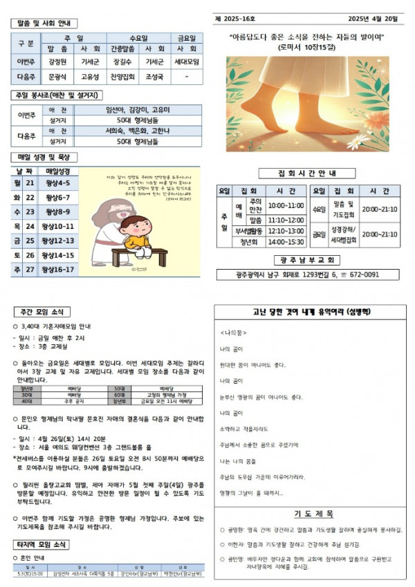 교회주보 2025년 4월 셋째주 주보 페이지 정보 작성일 05월 13일 2025년 본문 2025년 4월 셋째주 주보입니다. 목록 이전글 교회주보 2025년 4월 넷째주 주보 04월 19일 2025년 다음글 교회주보 2025년 4월 둘째주 주보 04월 19일 2025년