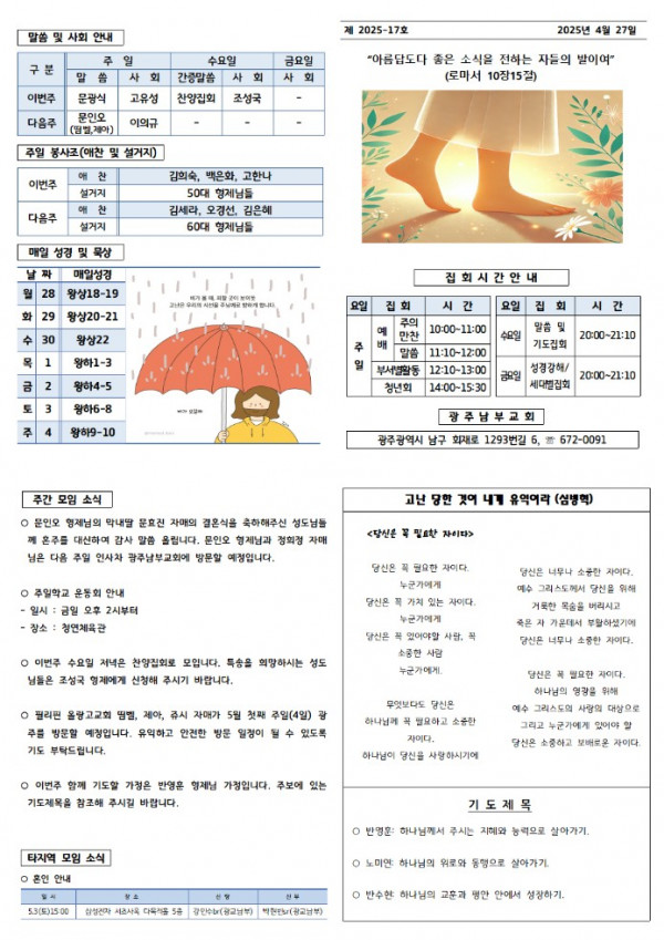 교회주보 2025년 4월 넷째주 주보 페이지 정보 작성일 05월 13일 2025년 본문 2025년 4월 넷째주 주보입니다. 목록 이전글 교회주보 2025년 5월 첫째주 주보 05월 13일 2025년 다음글 교회주보 2025년 4월 셋째주 주보 05월 13일 2025년