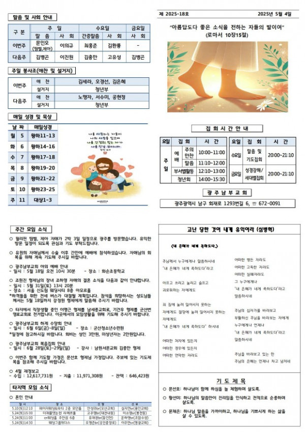 교회주보 2025년 5월 첫째주 주보 페이지 정보 작성일 05월 13일 2025년 본문 2025년 5월 첫째주 주보입니다. 목록 이전글 교회주보 2025년 5월 둘째주 주보 05월 13일 2025년 다음글 교회주보 2025년 4월 넷째주 주보 05월 13일 2025년