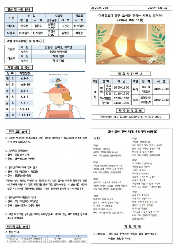 교회주보 2025년 6월 첫째주 주보 페이지 정보 작성일 06월 23일 2025년 본문 2025년 6월 첫째주 주보입니다. 목록 이전글 교회주보 2025년 6월 셋째주 주보 06월 23일 2025년 다음글 교회주보 2025년 5월 넷째주 주보 06월 23일 2025년