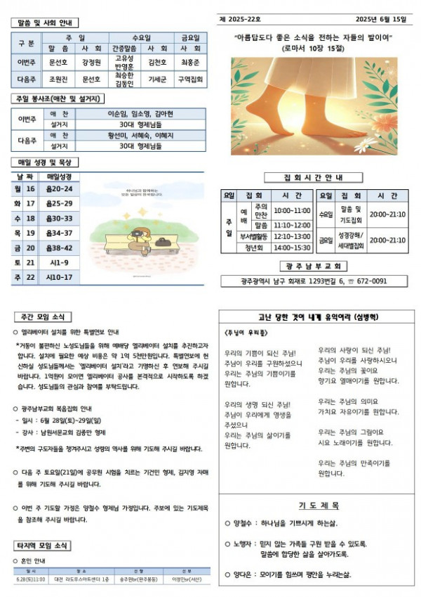 교회주보 2025년 6월 셋째주 주보 페이지 정보 작성일 06월 23일 2025년 본문 2025년 6월 셋째주 주보입니다. 목록 이전글 교회주보 2025년 6월 넷째주 주보 06월 23일 2025년 다음글 교회주보 2025년 6월 첫째주 주보 06월 23일 2025년