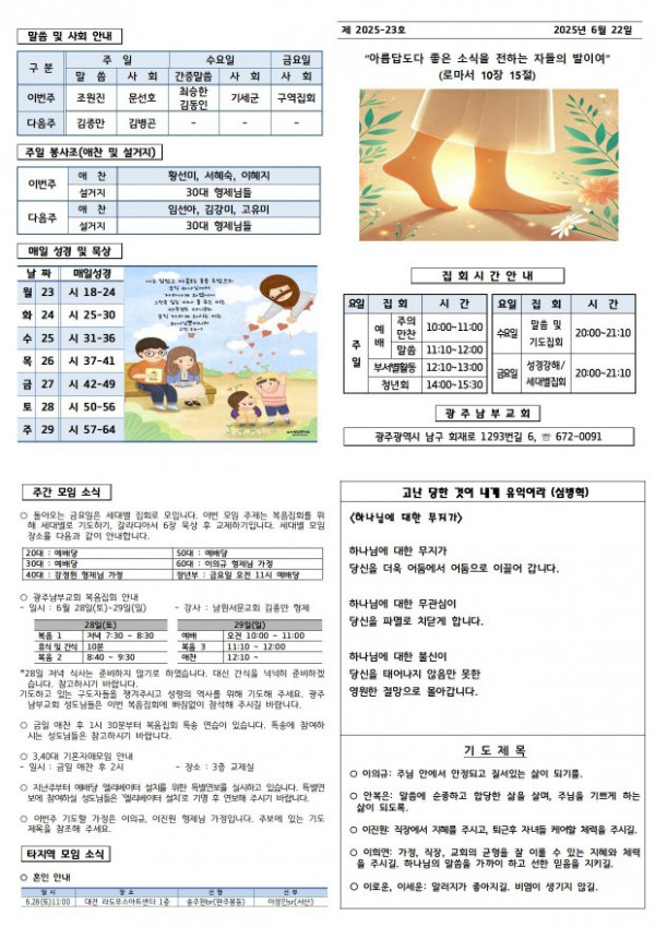 교회주보 2025년 6월 넷째주 주보 페이지 정보 작성일 06월 23일 2025년 본문 2025년 6월 넷째주 주보입니다. 목록 이전글 교회주보 2025년 6월 다섯째주 주보 06월 23일 2025년 다음글 교회주보 2025년 6월 셋째주 주보 06월 23일 2025년