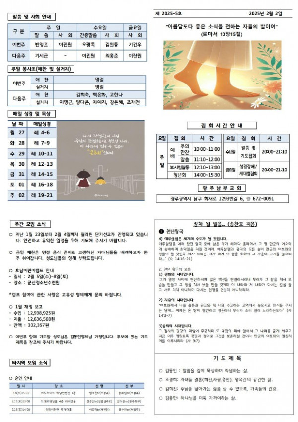 교회주보 2025년 2월 첫째주 주보 페이지 정보 작성일 04월 08일 2025년 본문 2025년 2월 첫째주 주보 목록 이전글 교회주보 2025년 2월 둘째주 주보 04월 08일 2025년 다음글 교회주보 2025년 1월 넷째주 주보 04월 08일 2025년