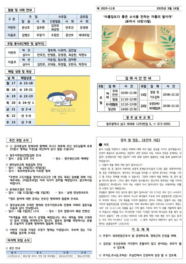 교회주보 2025년 3월 셋째주 주보 페이지 정보 작성일 04월 08일 2025년 본문 2025년 3월 셋째주 주보 목록 이전글 교회주보 2025년 3월 넷째주 주보 04월 08일 2025년 다음글 교회주보 2025년 3월 둘째주 주보 04월 08일 2025년
