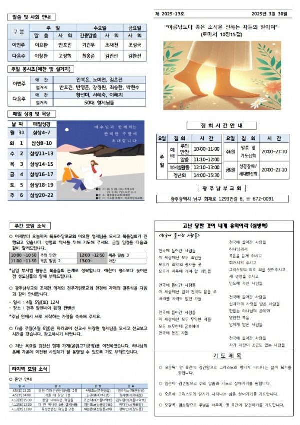 교회주보 2025년 3월 다섯째주 주보 페이지 정보 작성일 04월 08일 2025년 본문 2025년 3월 다섯째주 주보 목록 이전글 교회주보 2025년 4월 첫째주 주보 04월 08일 2025년 다음글 교회주보 2025년 3월 넷째주 주보 04월 08일 2025년