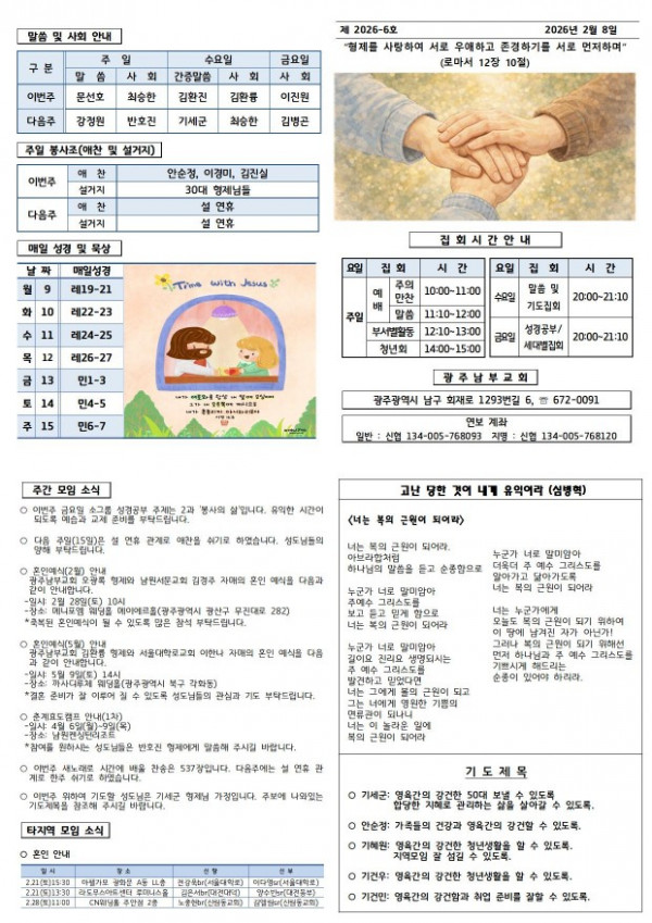 교회주보 2026년 2월 둘째주 주보 페이지 정보 작성일 04월 01일 2026년 본문 2026년 2월 둘째주 주보입니다. 목록 이전글 교회주보 2026년 2월 셋째주 주보 04월 01일 2026년 다음글 교회주보 2026년 2월 첫째주 주보 04월 01일 2026년